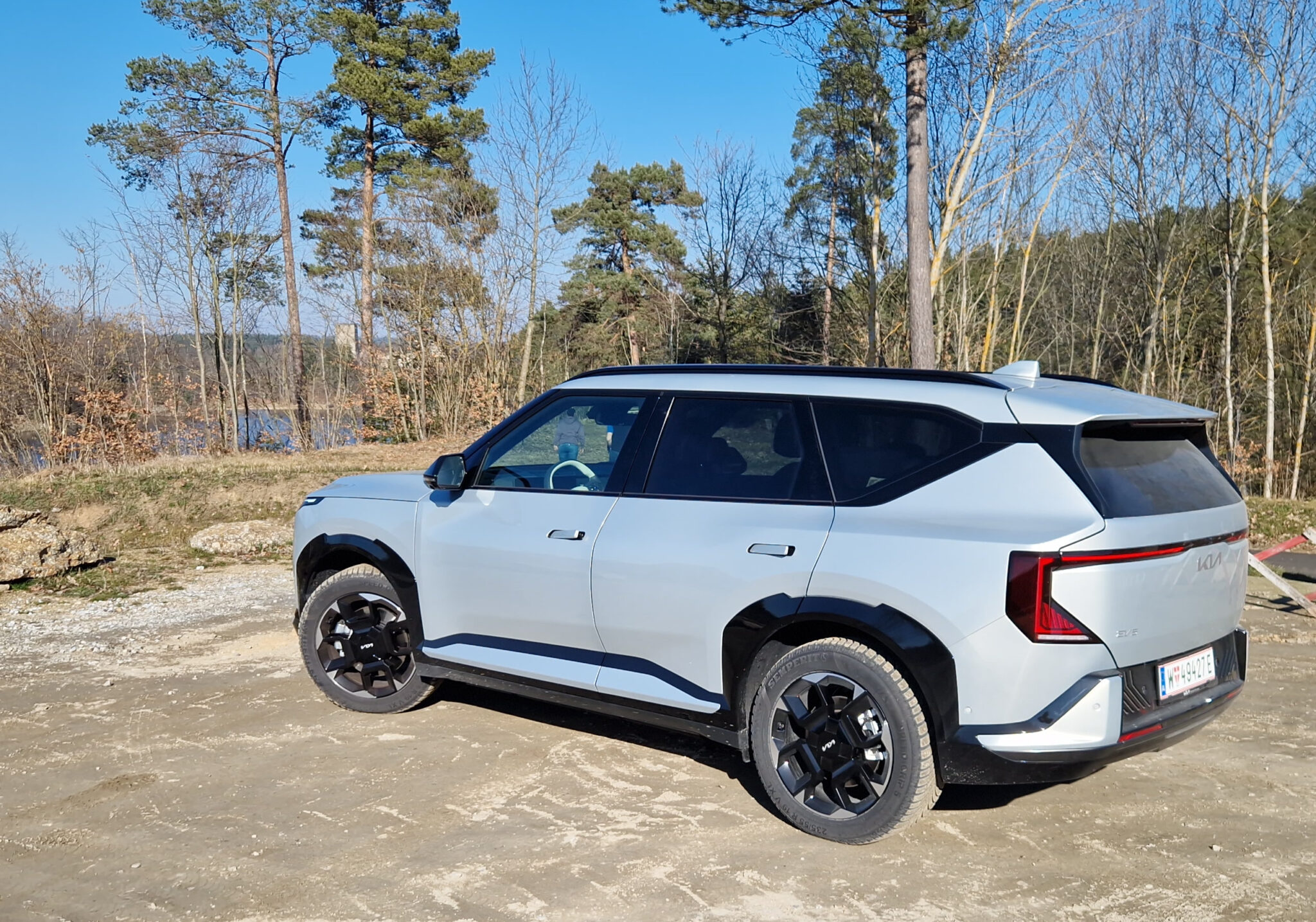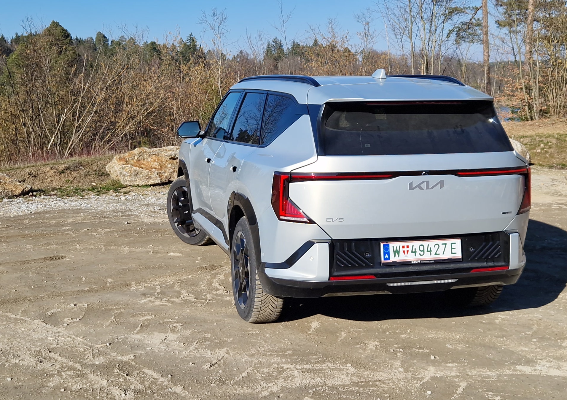 Die kantige Silhouette, eine markante D-Säule sowie die Kia-typische „Star Map“-Lichtsignatur, deren Grafik an Sternbild-Darstellungen angelehnt ist, gibt dem EV5 seine Marken Identität. Während die Front klar die Verwandtschaft zu den Schwester-SUVs EV9 und EV3 erkennen lässt, präsentiert sich das breite Heck mit den durch horizontale Linien erweiterten LED-Rückleuchten und dem großflächigen, abfallenden Heckspoiler durchaus eigenständig.