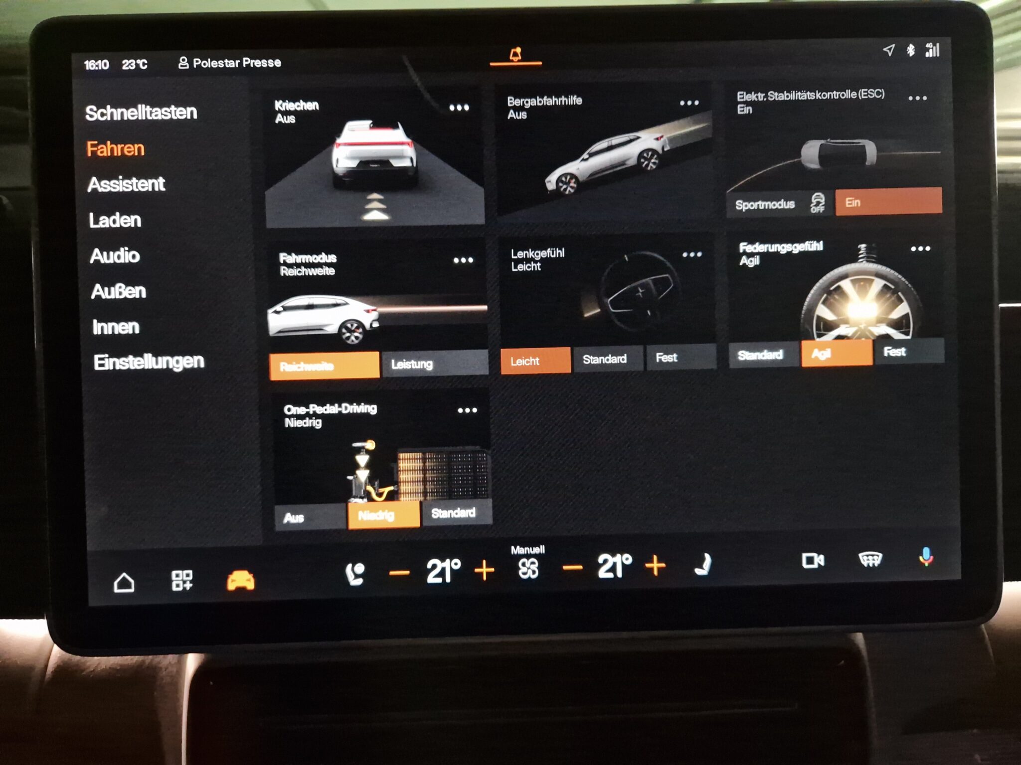 Der adaptive Tempomat arbeitet beeindruckend! Selbst in Passagen mit engeren Kurven fährt der Polestar auf der Autobahn souverän und präzise. Wird der gewählte Sicherheitsabstand allerdings durch einschneidende Fahrzeuge zu klein, dann rekuperiert der Polestar übermäßig stark. Einerseits ein Sicherheitsgewinn, da der Abstand rasch wieder hergestellt ist, zum Anderen aber in manchen Situationen eine Herausforderung für den nachfolgenden Verkehr.