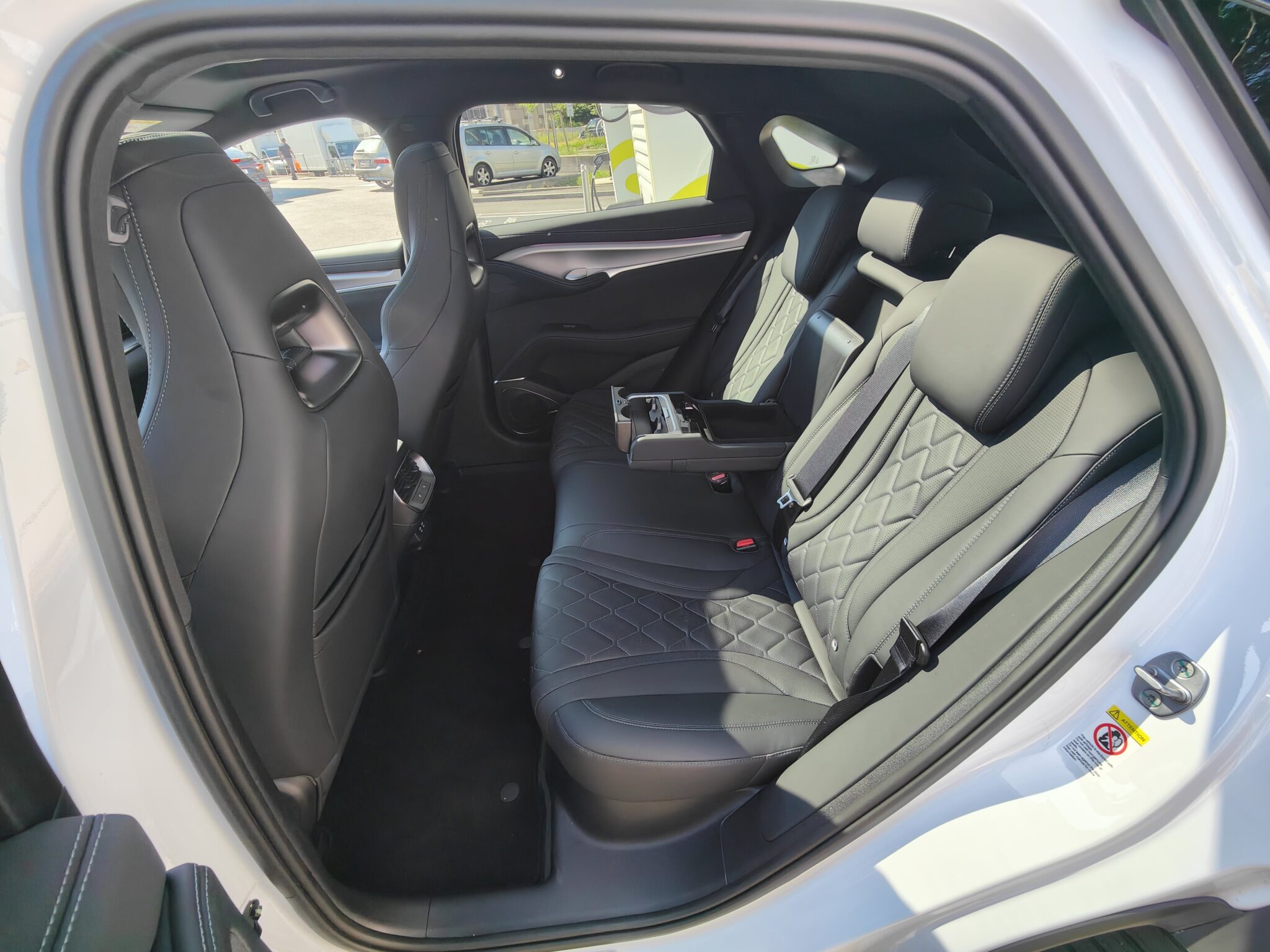 Gleich zu Beginn beeindruckt das Raumangebot für bis zu fünf Personen, gleich in welcher Reihe. Die dominante Mittelkonsole bietet vielfältige Stau- und Ablagemöglichkeiten sowie einen induktiven Ladeplatz, Becherhalter und weitere Anschlussmöglichkeiten. Verarbeitung und Materialqualität wirken hochwertig: weiches Leder, gepolsterte Flächen, kaum Hartplastik. Vorne sitzt man luftig, hinten überzeugt die Beinfreiheit. Für große Passagiere ist die Beinauflage wegen des relativ hohen Bodens leicht angewinkelt. Taschen und Fächer sorgen auch in der zweiten Reihe für ausreichend Stauraum. Insgesamt bleibt das Raumgefühl positiv, unterstützt durch ein großes Panorama-Glasdach mit elektrischer Verdunkelung.