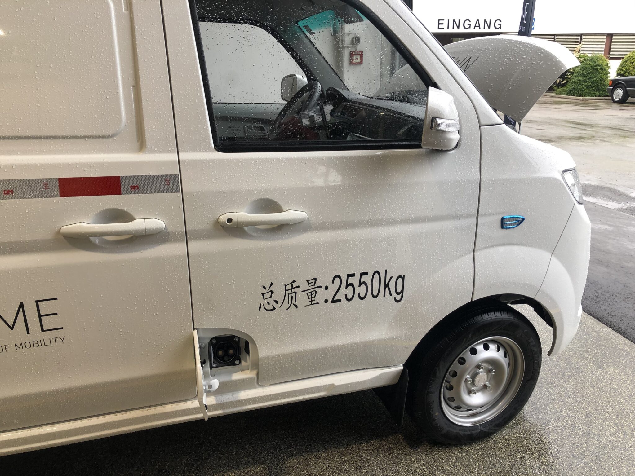 Der Van ist sehr wendig und hat kompakte Abmessungen (LxBxH 4,495m x 1,680 m x 1,990 m). Bei unserer Probefahrt (allerdings ohne Zuladung) fuhr sich das Fahrzeug E-Auto typisch sehr agil. In der Stufe „D“ ist die Motorleistung des Hinterradantriebs im Regelfall auf 30 kW begrenzt, man sieht das an der Anzeige „Eco“ im Display. Durch den Druck auf die „Sport“-Taste kann die Maximalleistung auf 60 kW angehoben werden, damit auch bei Ausnutzung der maximalen Zuladung genügend Kraft zur Verfügung steht.