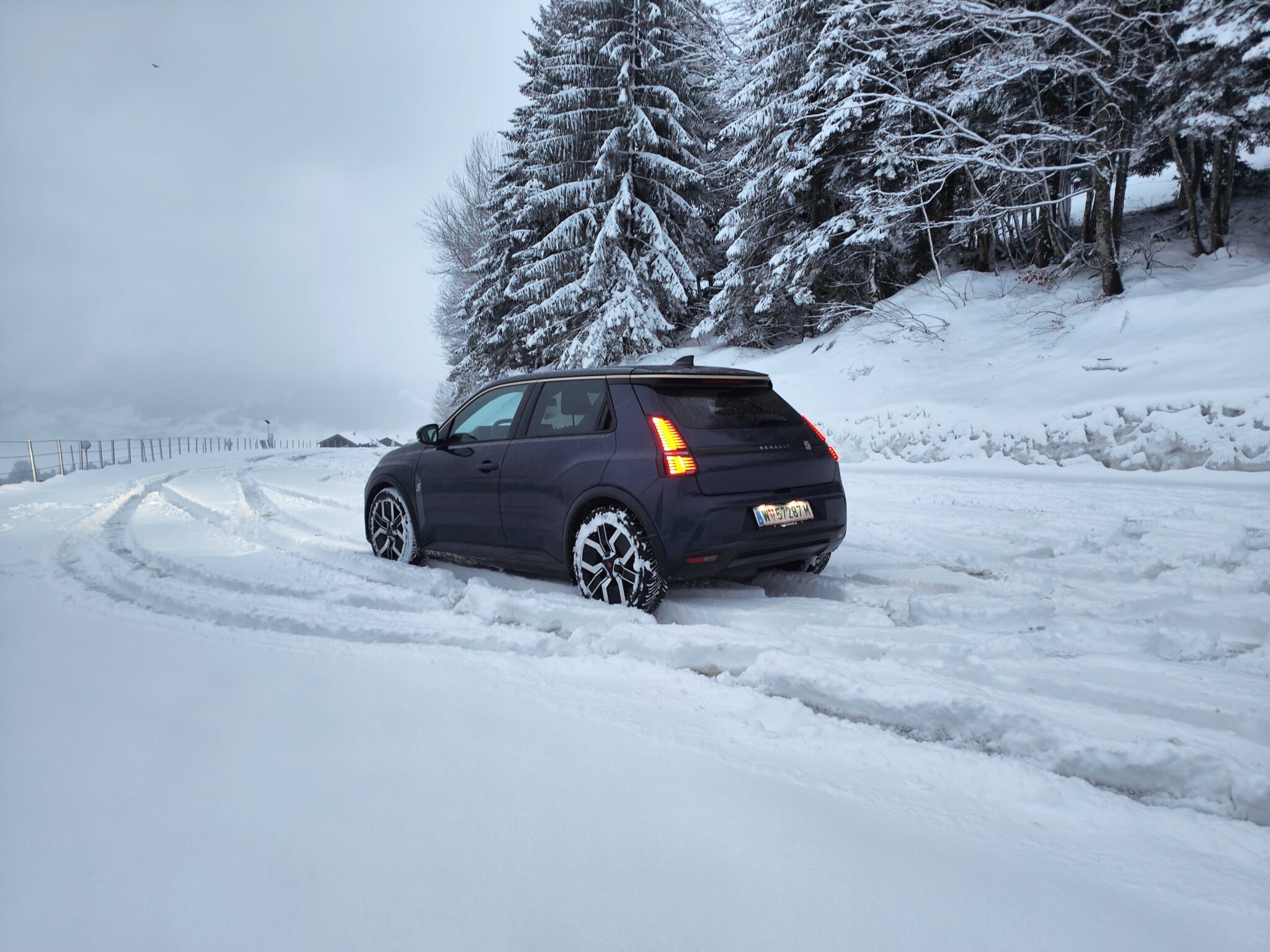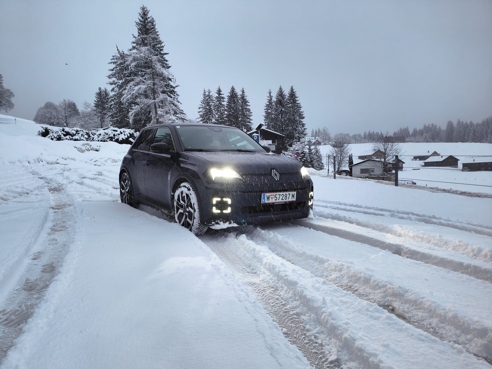 Auf der Langstrecke schlug sich der Renault R5 grundsätzlich einwandfrei, verlangte auf dieser Tour aber Disziplin bei der Ladeplanung. Der Test verlief unter widrigsten Bedingungen, mit Temperaturen zwischen -3° und 5° Celsius inklusive Schneeregen. Der Verbrauch lag, wie zu erwarten, höher als in milderen Jahreszeiten und bewegte sich zwischen 23 und 26 kWh/100 km. Für die rund 650 km zwischen Wien und Vorarlberg waren somit pro Richtung vier kurze Ladestopps für die zeiteffizienteste Route notwendig. Positiv hervorzuheben ist in diesem Zusammenhang, dass bei jeder Ladepause der Renault 5 eine konstante Ladegeschwindigkeit trotz niedriger Temperaturen und widriger Umstände aufwies und damit die Pausenlänge sehr berechenbar wurde.