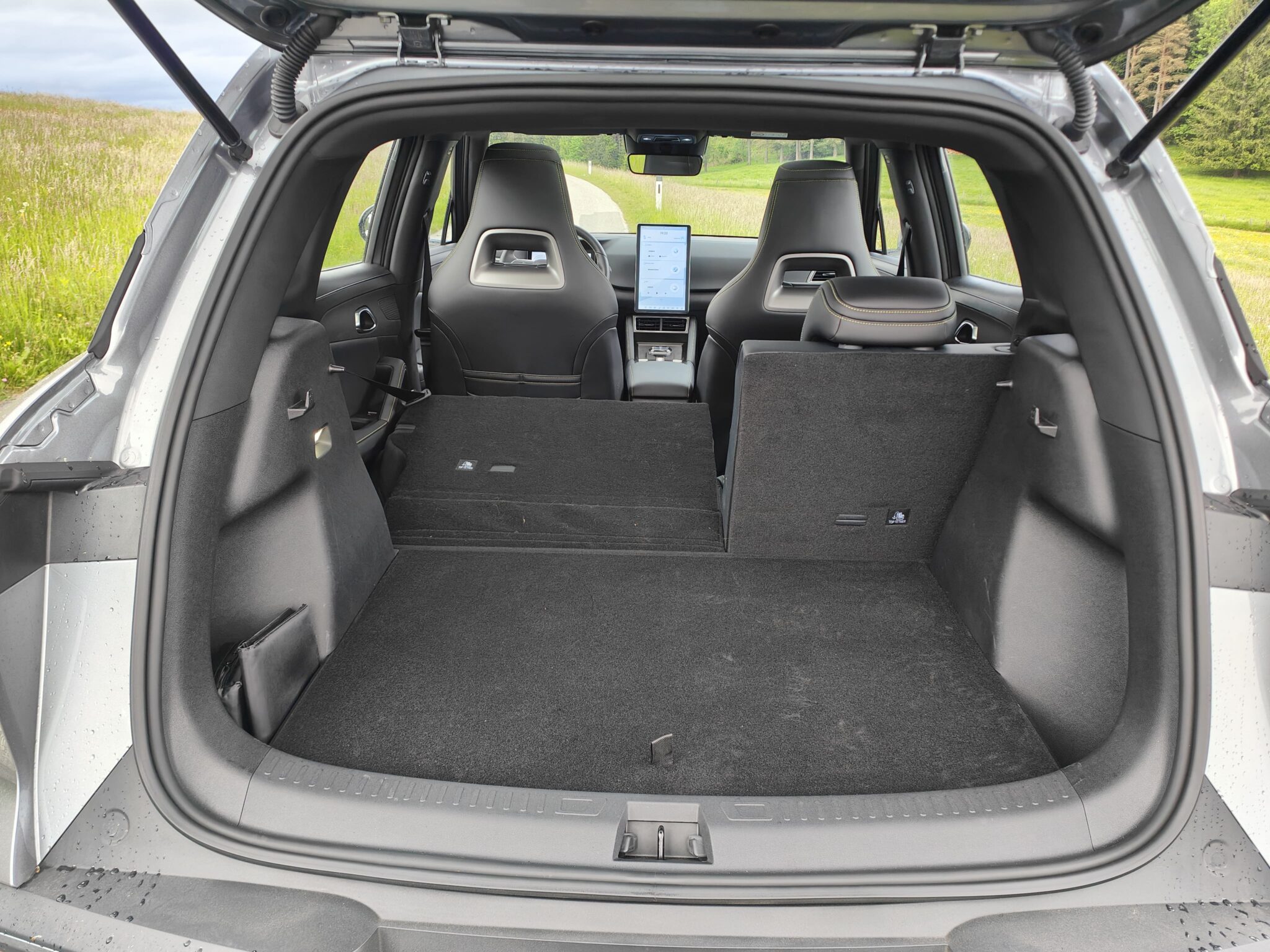 In der zweiten Reihe setzt sich der positive Eindruck fort. Auch für größere Personen ist ausreichend Bein- und Kopffreiheit vorhanden und ermöglicht auch auf längeren Fahrten ein komfortables Reisen. Vervollständigt wird das großzügige Raumgefühl durch ein groß dimensioniertes Panoramafenster. Genügend Stauraum findet sich auch im Kofferraum, der bei umgeklappten Sitzen einen nahezu ebenen Ladeboden ermöglicht, sowie über einen doppelten Boden verfügt. Verzichtet werden muss allerdings auf einen Frunk, obwohl Platz dafür vorhanden wäre.