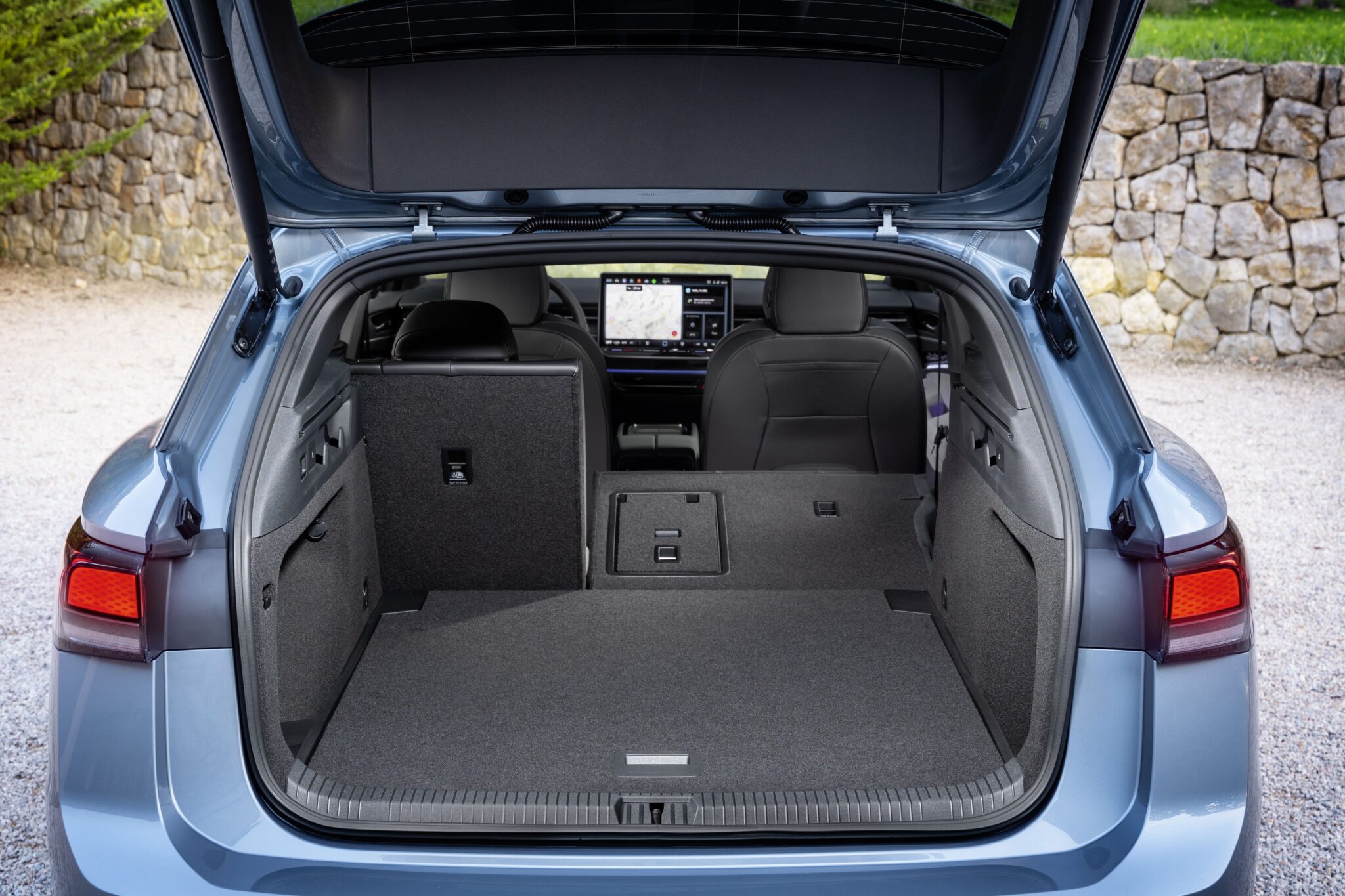 Der ID.7 Tourer differenziert sich im Heckbereich deutlich von der Schräghecklimousine. Prägend für das Design des elektrischen Kombis sind besonders die lange Dachlinie und deren eleganter Übergang in die Heckklappe. Stilistisch ist der Tourer eine Fusion aus einem klassischen Variant vom Format des Passat und einem dynamischen Shooting Brake im Stile des Arteon. Durch das Plus an Höhe im Heck ergibt sich gegenüber der Schräghecklimousine ein nochmals vergrößertes Kofferraumvolumen: Mit fünf Personen an Bord nimmt der ID.7 Tourer ein Gepäckvolumen von bis zu 605 Litern auf (Rücksitzbanklehne in der Cargo-Stellung). Bis an die Lehnen der Vordersitze und dachhoch beladen, steigt dieser Wert auf bis zu 1.714 Liter.