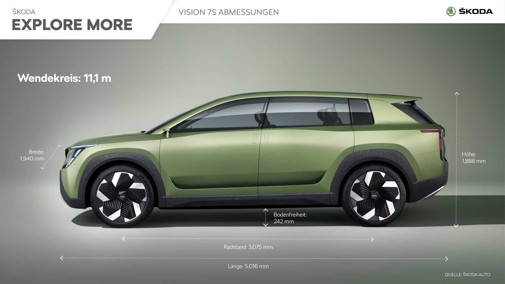 Die Konzeptstudie VISION 7S gibt einen ersten konkreten Ausblick auf ein völlig neues ŠKODA‑Modell und zeigt gleichzeitig die neue Designsprache. Das rein elektrische SUV bietet ein großzügiges Platzangebot für bis zu sieben Passagiere und zahlreiche Simply Clever-Details. Damit rundet der Autohersteller sein Produktportfolio und seine Kundenbasis nach oben hin ab. Die Konzeptstudie basiert auf dem Modularen Elektrifizierungsbaukasten (MEB) aus dem Volkswagen Konzern und verfügt über eine 89-kWh-Batterie. Damit lässt sich eine maximale Reichweite von mehr als 600 Kilometern im WLTP-Zyklus erzielen. Weiters beherrscht er Schnellladen mit 200 kW.