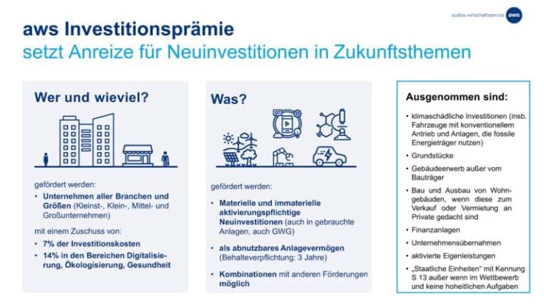 Um die österreichische Wirtschaft in Folge der Corona-Krise zu unterstützen, hat die Bundesregierung mit der aws Investitionsprämie ein neues Förderungsprogramm konzipiert, welches ein Anreiz für Unternehmensinvestitionen schafft.